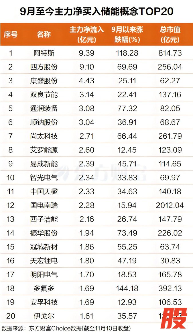 东方财富Choice数据显示,自9月以来,主力资金净买入多只储能概念股,其中阿特斯排名第一,主力净买额9.4亿元,9月以来累计涨幅超118%;四方股份排名第二,主力净买额9.1亿元,9月以来累计涨幅也超过了69%。